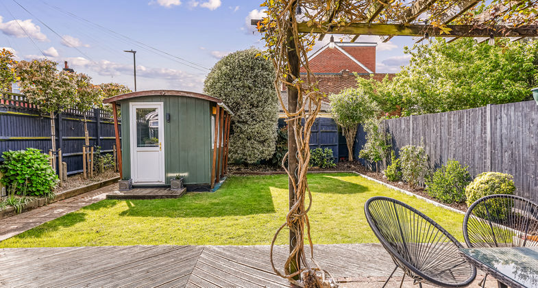 The wide rear garden has a grass central area with flower beds surrounding it, and paving stones leading to the garden office, along with a decked seating area with a lovely pergola above. There is further storage with a garden shed.